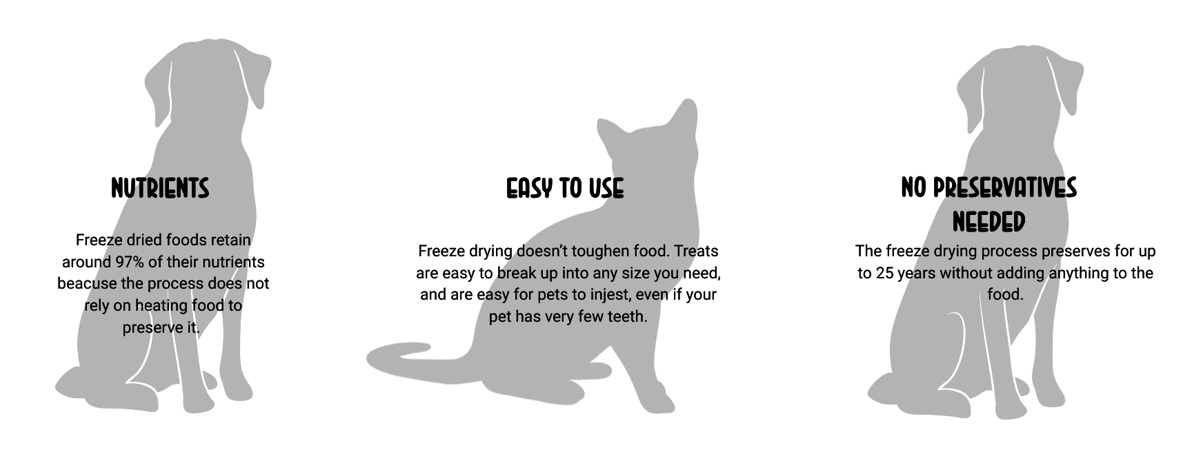Freeze drying removes all the water from food by first freezing it, and then very slowly converting the ice to water vapor so that it can be removed from the product without using heat to preserve food, which ultimately degrades nutrients. The only heat used in the freeze drying process is a small amount of heat beneath the trays that allows the ice to convert to water vapour. Once all the water is removed, the product is brought up to room temperature slowly and immediately packaged with an oxygen absorber to prevent oxygen from degrading the products over time. The result is a nutrient dense, high value treat that’s easy to feed your pet.