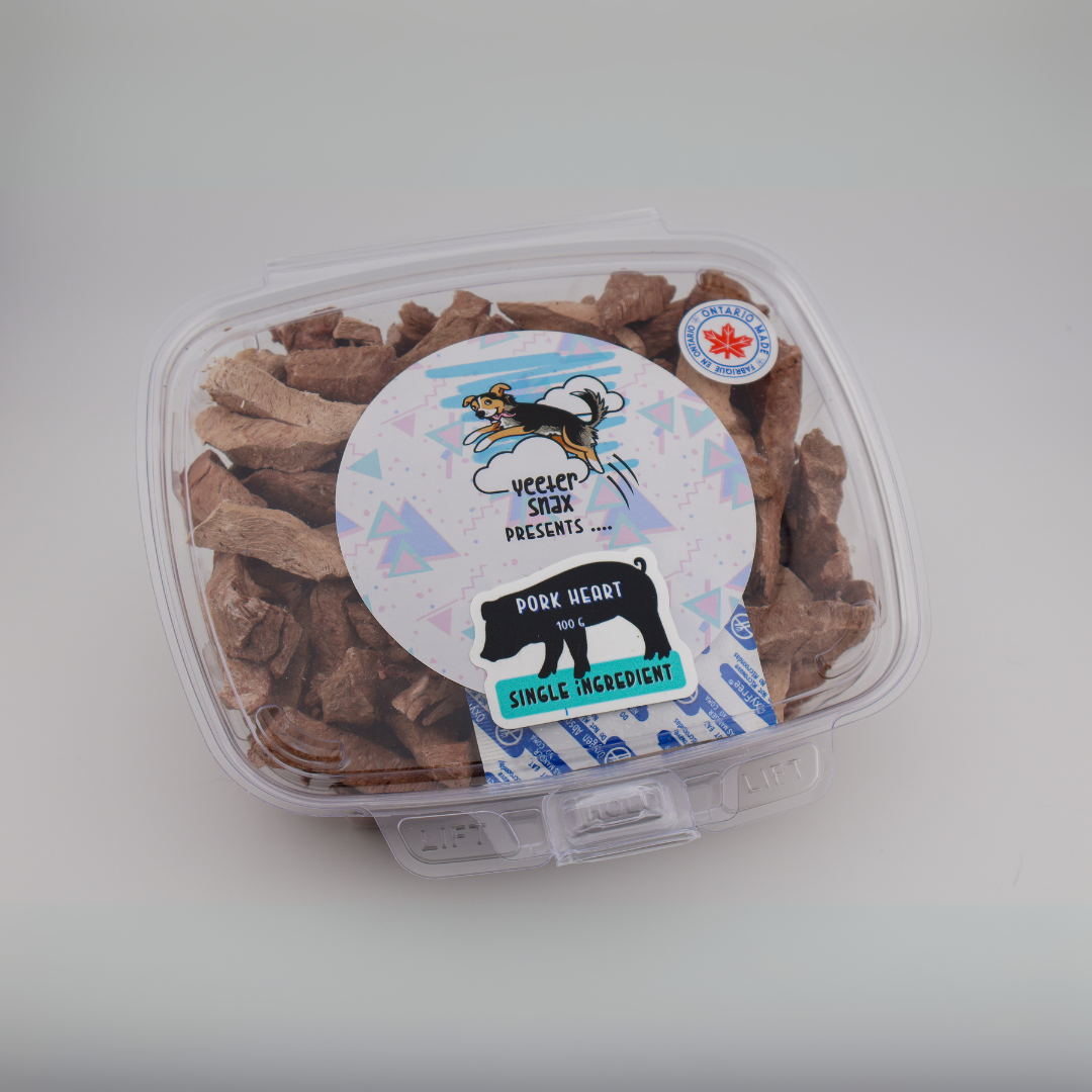 Pork hearts cut up into easy to feed pieces, then freeze dried.